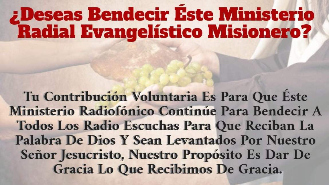 Este ministerio radial cristiano está siendo guiado bajo la dirección del Espíritu Sando de Dios por lo cual NO LUCRAMOS CON SU SANTA PALABRA, ya que El Señor todo lo provee, y nuestro propósito es enriquecerte del conocimiento del conocimiento biblico y que tengas grandes experiencias con los encuentros con tu creador Dios y así reconciliandote a El por medio del Salvador de este mundo entero Jesucristo mismo.